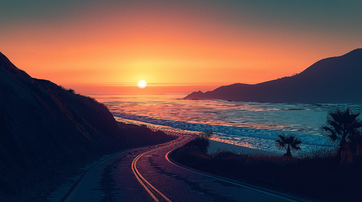 Bewonder ons prachtige foto behang met een spectaculair uitzicht op een zonsondergang, waar een kronkelige weg langs de zee loopt en een sfeer van ...