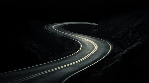 Deze foto behang heeft een boeiend minimalistisch landschap, waar een kronkelende weg is getekend op een intense zwarte achtergrond, waardoor een s...