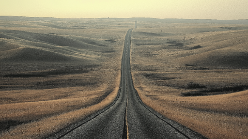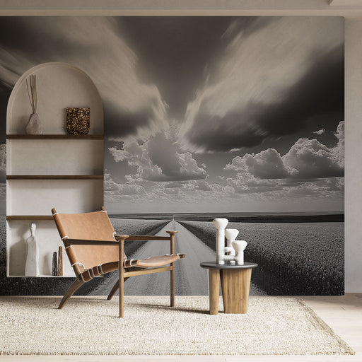 Deze foto behang legt de schoonheid van een monochroom landschap vast, met een verlaten weg die eindeloos uitstrekt, omringd door velden. De lucht,...