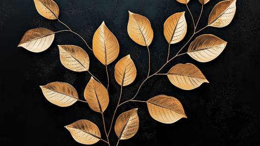 WonderMuralDeze foto behang heeft een elegant ontwerp van gouden bladeren, subtiel geplaatst op een zwarte achtergrond. De reliëfstructuur voegt een boeiende ...