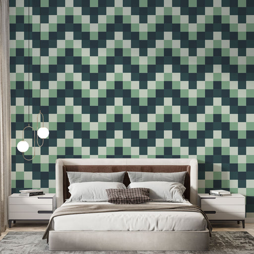 Studio SamaDeze moderne schaakbord muurschildering heeft een fascinerend geometrisch ontwerp in zwart en lichtgroen. De zigzagpatronen creëren een indruk van ...