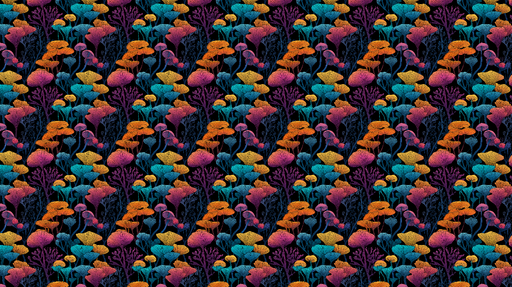 WonderMuralDeze behang belichaamt een magisch universum met zijn kleurrijke paddenstoelenpatroon en levendige tinten blauw, oranje en paars. Het rijke kleuren...