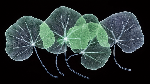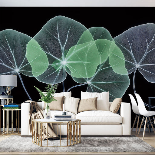 WonderMuralDeze unieke foto behang benadrukt een patroon van doorschijnende bladeren in groene en witte tinten, waardoor een effect van lichtheid en verfijnin...