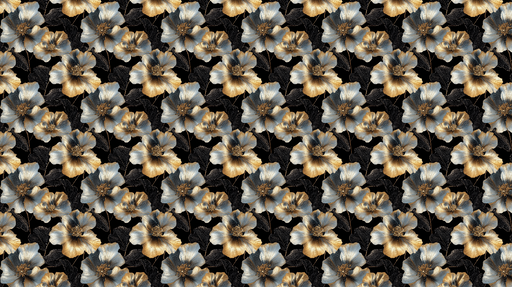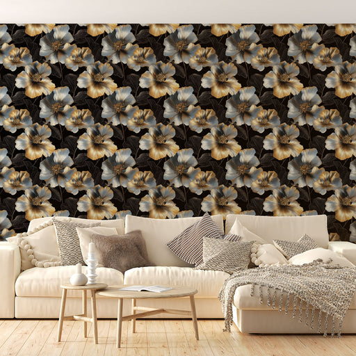 WonderMuralDeze behang toont een fascinerend patroon van gouden en blauwe bloemen die bloeien tegen een zwarte achtergrond die hun levendige kleuren accentuee...