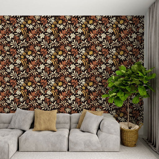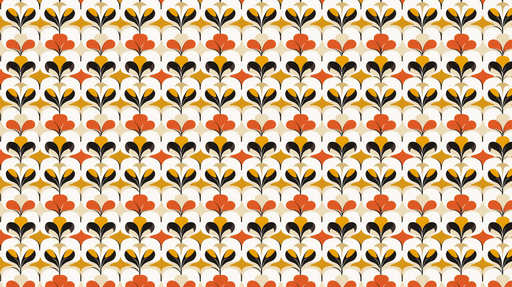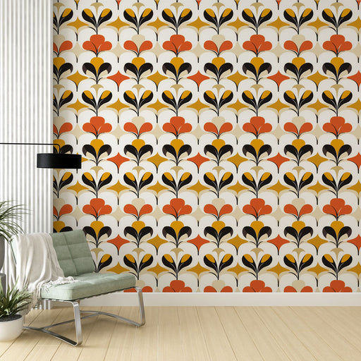 WonderMuralDeze levendige Foto Behang heeft een retro bloemenpatroon versierd met gestileerde bloemen in oranje, geel en zwart, wat tijdloze charme oproept. D...