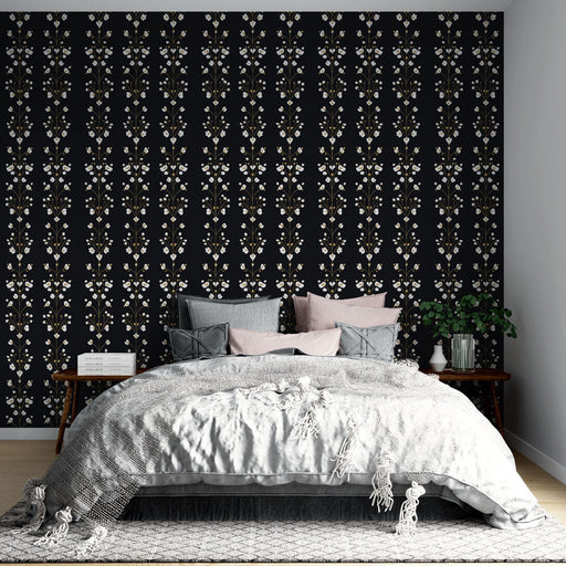WonderMuralDeze behang heeft een delicaat bloemenpatroon, met bloemen in crèmekleurige tinten en een zwarte achtergrond om een opvallend contrast te creëren. ...