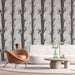 Deze foto behang heeft een elegante monochrome bloemenpatroon, waarbij gestileerde bloemen en boomstammen in zwart-wit tinten worden benadrukt. Het delicate ontwerp creëert een artistieke en eigentijdse sfeer, perfect voor degenen die op zoek zijn naar een strakke en verfijnde stijl.
