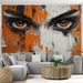Deze betoverende foto behang benadrukt een expressief gezicht omringd door vlakken van oranje, zwart en wit, waardoor een opvallend visueel contrast ontstaat. De details van de heldere ogen trekken de aandacht, terwijl de rijke textuur diepte aan het stuk toevoegt.