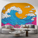 Een wind van vrijheid waait over dit foto behang met dynamische en kleurrijke golven. Geïnspireerd door tekenfilms, toont dit patroon imposante en gestileerde golven die oprijzen onder een heldere oranje lucht. Het contrast tussen het blauw van de golven en de roze en paarse golvende bergen creëert een energieke en vrolijke sfeer. De wolken brengen daarentegen een vleugje lichtheid in deze maritieme scène.