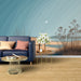 Deze behang biedt een gestileerde weergave van een kustlandschap, waar zachte tinten blauw en beige samensmelten om een serene sfeer te creëren. Het decor benadrukt een heldere lucht, een rustige uitgestrektheid van water en delicate grassen, waardoor een organische touch aan uw interieur wordt gegeven.