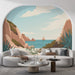 Deze foto behang toont een ontspannend kustlandschap, waar een zeilboot rustig vaart in een baai omringd door majestueuze rotsen in zachte tinten. De lucht met lichte en zwevende nuances voegt een gevoel van sereniteit toe aan de algehele compositie.
