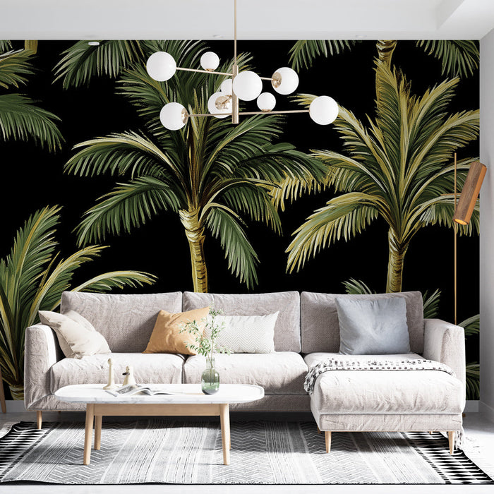 Foto Behang palm bomen | Weelderige palm bomen op een zwarte achtergrond