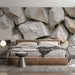 Ontdek ons foto behang met stenen texturen in tinten wit en grijs, wat een ruwe en elegante uitstraling biedt. Elke steen is zorgvuldig gedetailleerd, waardoor een illusie van diepte en reliëf ontstaat die een authentieke touch aan uw interieur zal geven.