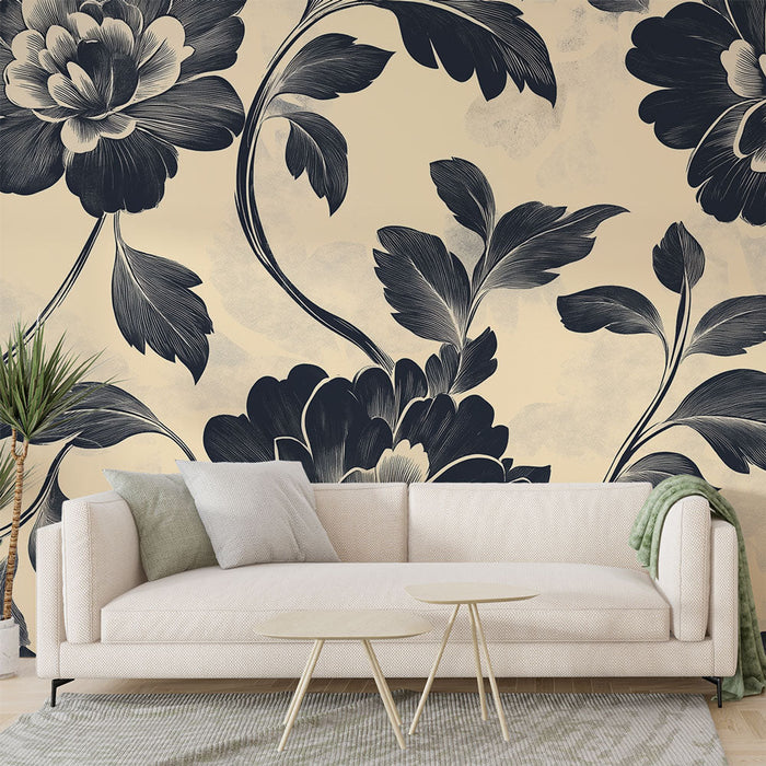 Deze shabby chic foto behang wordt gekenmerkt door zijn elegante patroon van grote en volle bloemen geschilderd in diepe zwarte tinten, die contrasteren met een zachte beige achtergrond. De verfijnde details van de bloemen en bladeren creëren een sfeer die zowel chic en romantisch is, ideaal om karakter toe te voegen aan elke kamer.