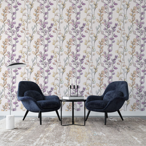 WonderMuralDenne tapeten skiller seg ut med sitt delikate akvarellblad-mønster i nyanser av lilla, beige og gull, og skaper en myk og beroligende atmosfære. D...