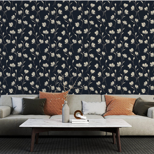 WonderMuralVår eksklusive Fototapet har et raffinert mønster av hvite blomster stilisert på en midnattsblå bakgrunn, og skaper en atmosfære som er både sofist...