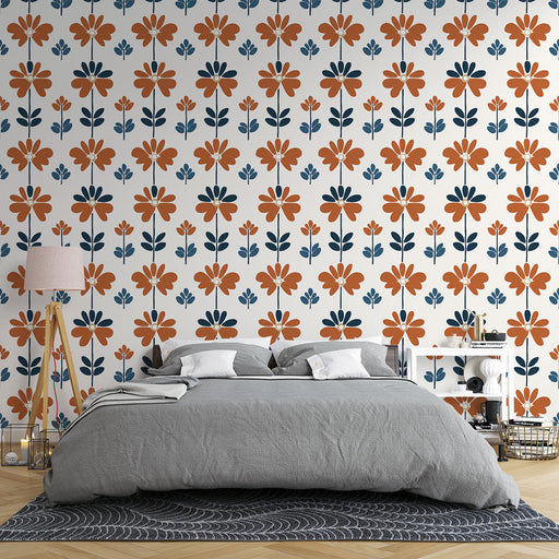 WonderMuralVår eksklusive fototapet viser et fengslende mønster av oransje blomster og marineblå, og skaper en levende og gledelig atmosfære i ethvert rom. De...