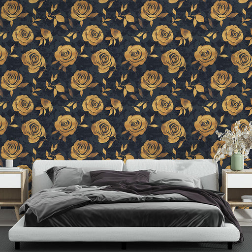 WonderMuralVår Fototapet vekker den tidløse sjarmen til gyldne roser som står storslått mot en midnatt blå bakgrunn. Blomstene, med sine delikate gulltoner, g...
