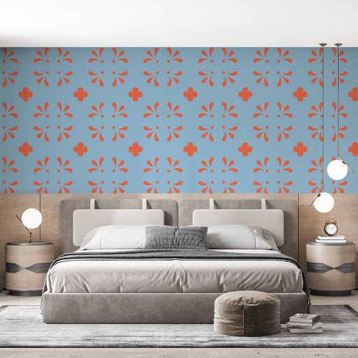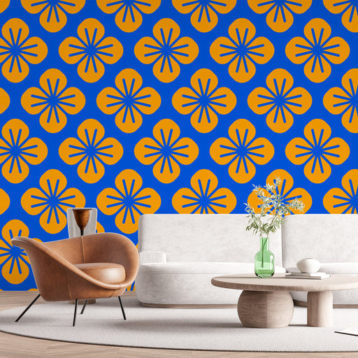 Studio SamaDette fototapet med blomstermønster har et fengslende geometrisk mønster av orange og blått, perfekt for å legge til livlighet og stil til ethvert ...