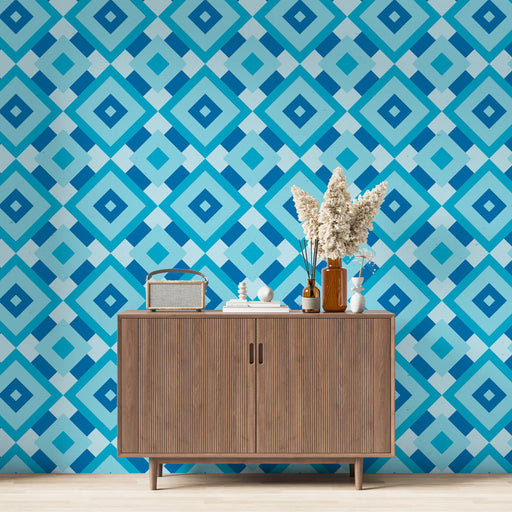 Studio SamaDette geometriske fototapetet tilbyr et elegant design med azurblå diamantmønstre. Perfekt for å legge til en moderne og stilig touch til interiøre...