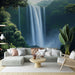 Dette fototapetet avslører et praktfullt fosselandskap der vannet kaskader nådigt gjennom en frodig skog. Nyansene av grønt i løvverket skaper en beroligende atmosfære, mens den lette tåken ved foten av fossen legger til et snev av mysterium og ro.