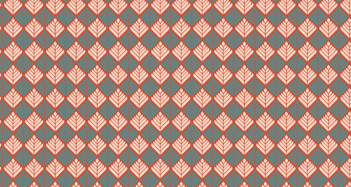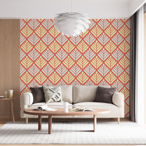 Studio SamaDette grafiske tapetmaleriet har et slående mønster av geometriske blader i mursteinrød og tealblå toner. Ideell for å legge til en moderne og eleg...