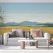 Vår fototapet fremkaller et praktfullt landskap av en gyllen eng under en klar blå himmel, prydet med silhuetter av fjell i det fjerne. Markene, badet i lys, bringer en atmosfære av ro og naturlig varme, ideell for å skape en innbydende stemning i interiøret ditt.