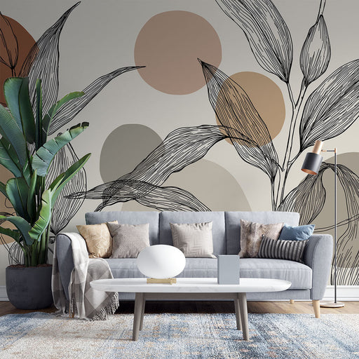 WonderMuralDette elegante fototapetet har et delikat løvemønster omgitt av sirkler i varme toner. De svarte linjene på bladene fletter seg elegant inn i terra...