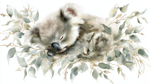 WonderMuralVår eksklusive Fototapet har en delikat illustrert sovende koala, omgitt av eukalyptusblader i myke, beroligende nyanser. De fine detaljene og past...