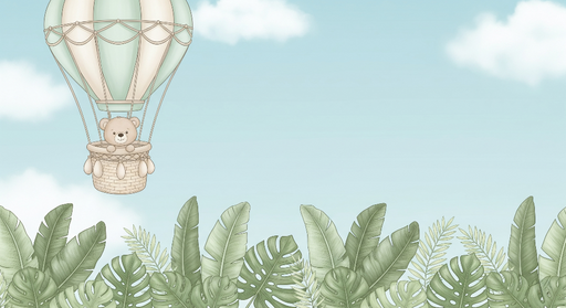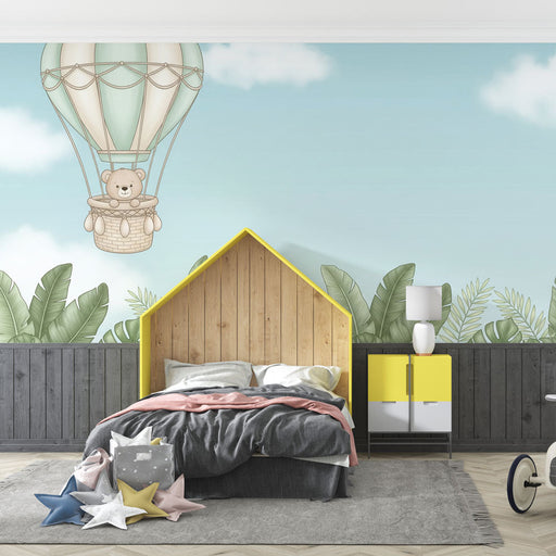 WonderMuralDette sjarmerende fototapetet har en glad teddybjørn som flyter i en varmluftsballong, omgitt av en beroligende bakgrunn av lette skyer og frodig t...