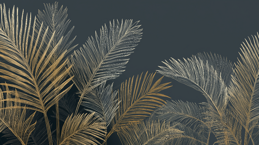 WonderMuralDette fototapetet viser et vakkert motiv av gyldne palmetrær delikat tegnet på en mørk bakgrunn, og skaper en luksuriøs og beroligende atmosfære. D...