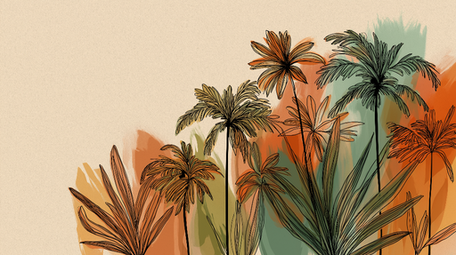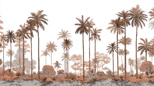 WonderMuralDenne tapeten fremhever et elegant palmetre motiv, med fint tegnede konturer, som skiller seg ut mot en bakgrunn med myke pastellfarger. De varme o...
