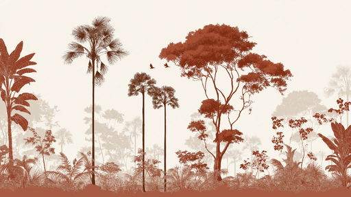 WonderMuralOppdag vår Fototapet som illustrerer et fengslende jungellandskap, der treterskler er avbildet i nyanser av jordlig rød og myk beige. Dette kunstne...