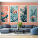 Dette praktfulle fototapetet har et sett med fire paneler som illustrerer delikate orkideer og frodige tropiske blader. Tonene av korall og grønn blander seg harmonisk for å skape en beroligende og livlig atmosfære, perfekt for de som ønsker å bringe et snev av natur inn i interiøret sitt.