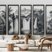 Dette unike fototapetet har et fengslende tropisk landskap i svart og hvitt, som fremhever majestetiske fossefall omgitt av frodig løvverk. De forskjellige panelene skaper en harmonisk komposisjon som fremkaller en reise inn i hjertet av den ville naturen. De delikate detaljene av palmetrærne og steinene bidrar til denne oppslukende effekten, ideell for å bringe et snev av eksotisme til interiøret ditt.