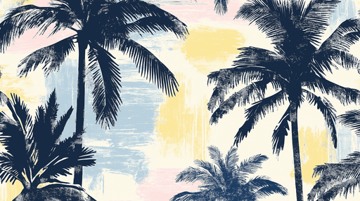 WonderMuralDette Mural Wallpaper gjenspeiler ånden av tropene med et levende mønster av palmetrær i silhuett, satt mot en blanding av myke nyanser av blå, gul...