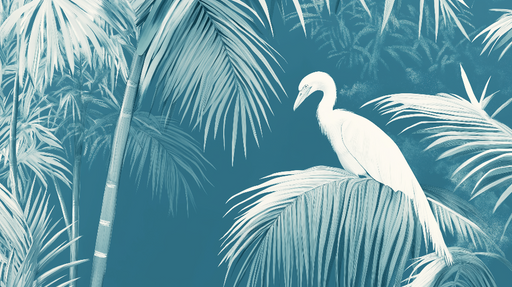 WonderMuralOppdag vår vakre fototapet som blander tealblå med delikate illustrasjoner av palmer og en majestetisk hvit hegre. Dette tropiske designet gir en b...