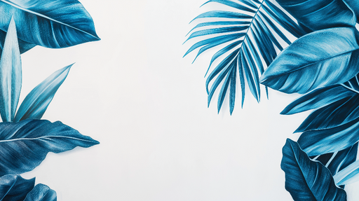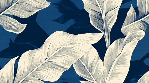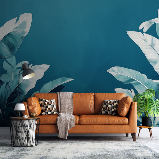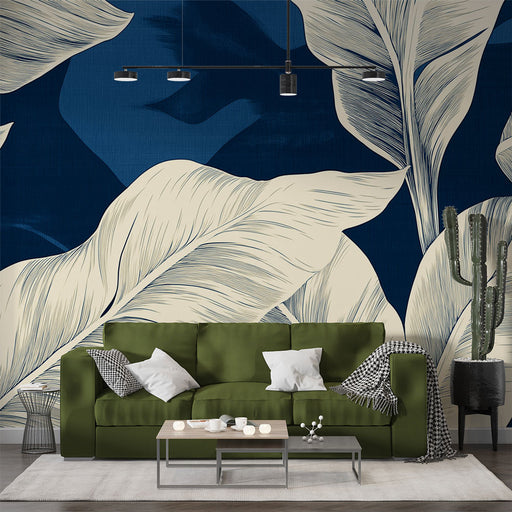 WonderMuralOppdag vår fengslende fototapet med store tropiske blader fint tegnet på en dyp blå bakgrunn. Nyansene av blått og krem gir en elegant kontrast, og...