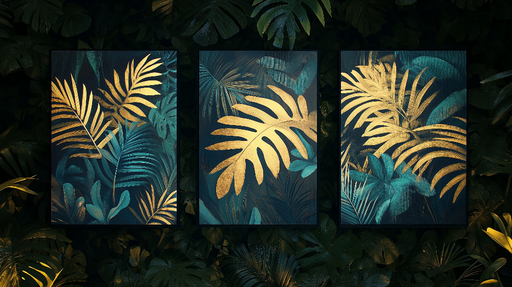 WonderMuralOppdag vårt fengslende fototapetdesign, som viser majestetiske tropiske blader på en strålende gullbakgrunn. De grønne nyansene i bladene gir en fø...