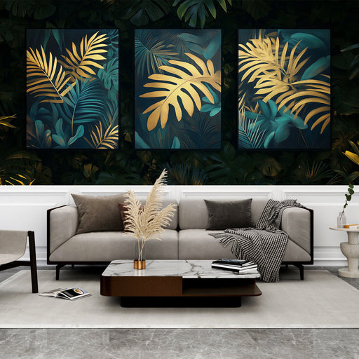 WonderMuralOppdag vår fengslende fototapet som viser en elegant trio av tropiske blader i gyldne toner, og skaper en vakker kontrast mot en mørk bakgrunn. De ...