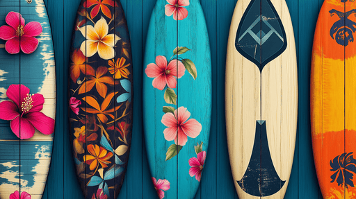 Vis fulle detaljerFototapet surfebrett | Fargerike surfebrett pyntet med tropiske blomster mønstre