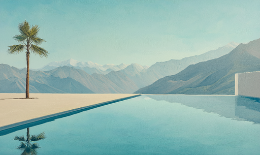 Vis fulle detaljerFototapet landskap av fjell | Palm trær og lyse refleksjoner av et basseng