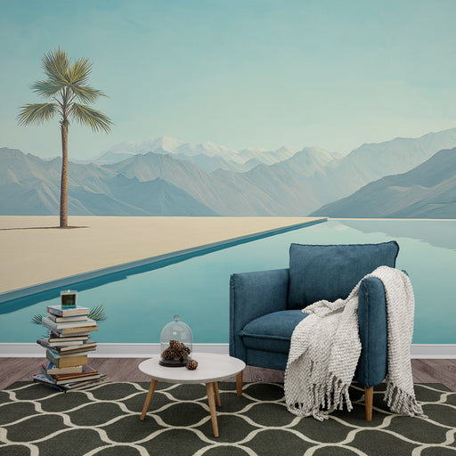 WonderMuralOppdag vår fototapet med en fortryllende tropisk landskap, der majestetiske fjell og frodige palmer blander seg sammen. De myke nyansene av blått o...