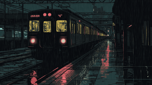 WonderMuralDette vakre fototapetet fanger skjønnheten av en bytog parkert under en mild regn, med levende refleksjoner på den våte bakken. Toglysene, blandet ...