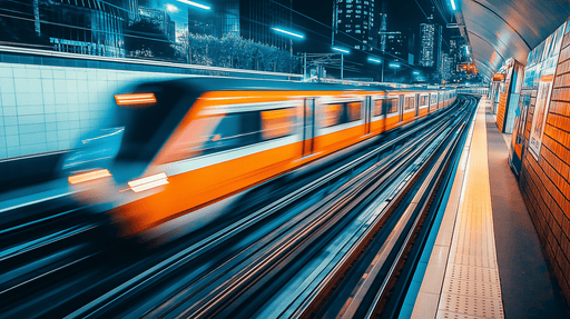 WonderMuralDenne fototapeten illustrerer en levende scene av en t-bane i bevegelse, fanget med et spill av nattlys som skaper en dynamisk og moderne atmosfære...