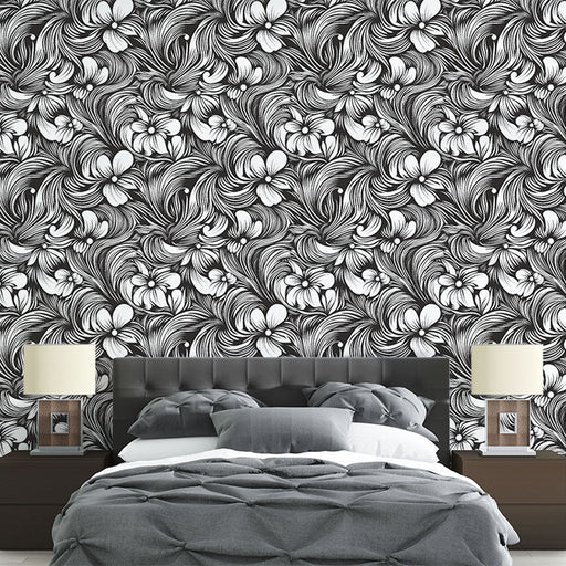 WonderMuralVår fototapet har et delikat blomstermønster i svart og hvitt, der ulike blomster flettet harmonisk sammen. De fine detaljene i blomsterbladene og ...