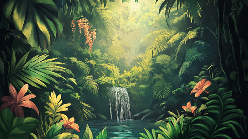 WonderMuralDette murale tapetet fremkaller en tropisk paradis, som illustrerer en frodig jungel rik på vegetasjon og prydet med en praktfull foss. Nyansene av...