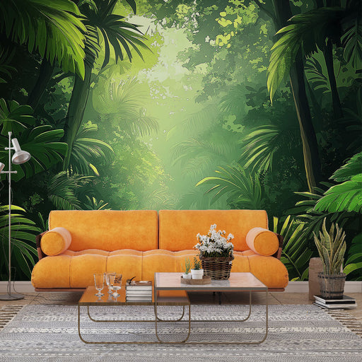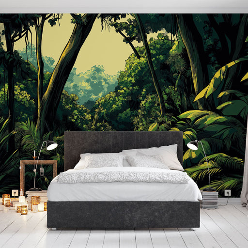 WonderMuralVår fototapet vekker en frodig jungel , der lyset trenger gjennom tett løvverk og skaper en varm og beroligende atmosfære. Grønnfargene på de stor...