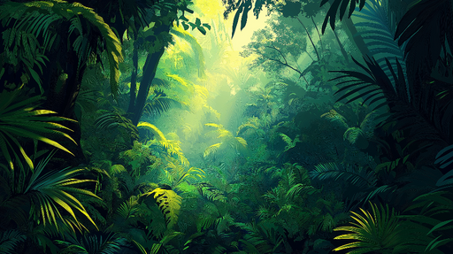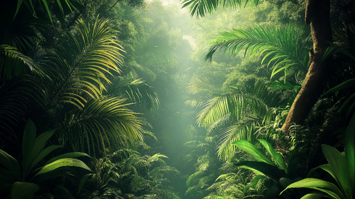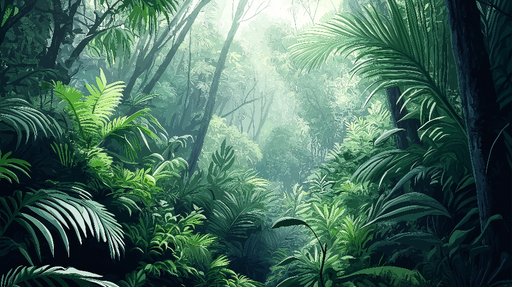 WonderMuralDette fantastiske fototapetet fremkaller en tett tropisk jungel, der lyset filtrerer gjennom frodig løvverk og skaper en fengslende atmosfære. Nyan...