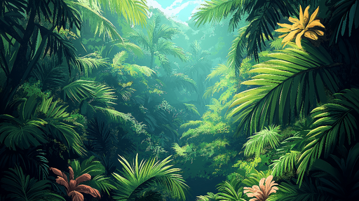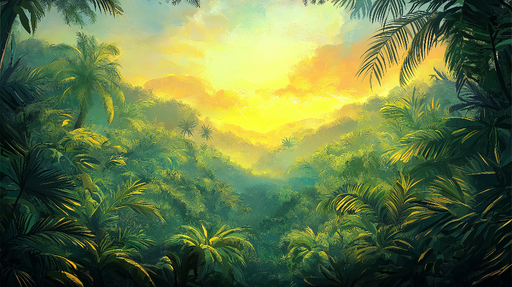 WonderMuralDenne fototapeten fanger essensen av en livlig jungel, badet i det gyldne lyset av en soloppgang. Den overdådige løvverket og nyanser av grønt skap...